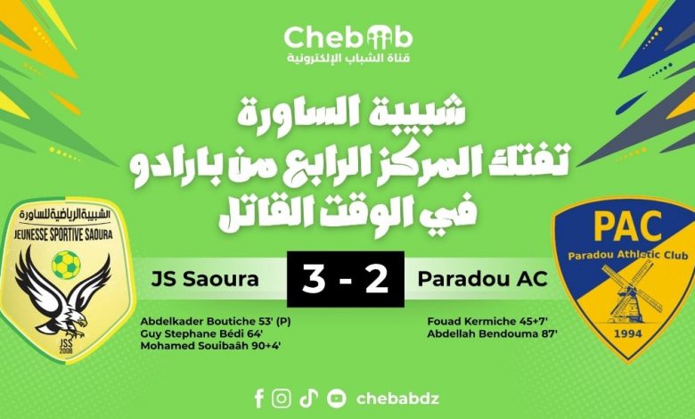 في مباراة مثيرة حتى اللحظات الأخيرة، نجحت شبيبة الساورة في اقتناص فوز ثمين أمام نادي بارادو، لتفتك بذلك المركز الرابع في ترتيب البطولة الوطنية، وذلك في الوقت القاتل من عمر اللقاء. الانتصار منح الفريق ثلاث نقاط حاسمة، عززت موقعه ضمن المراتب المؤهلة للمنافسات القارية، في حين تراجع نادي بارادو خطوة في سلم الترتيب بعد أداء دفاعي لم يصمد حتى صافرة…